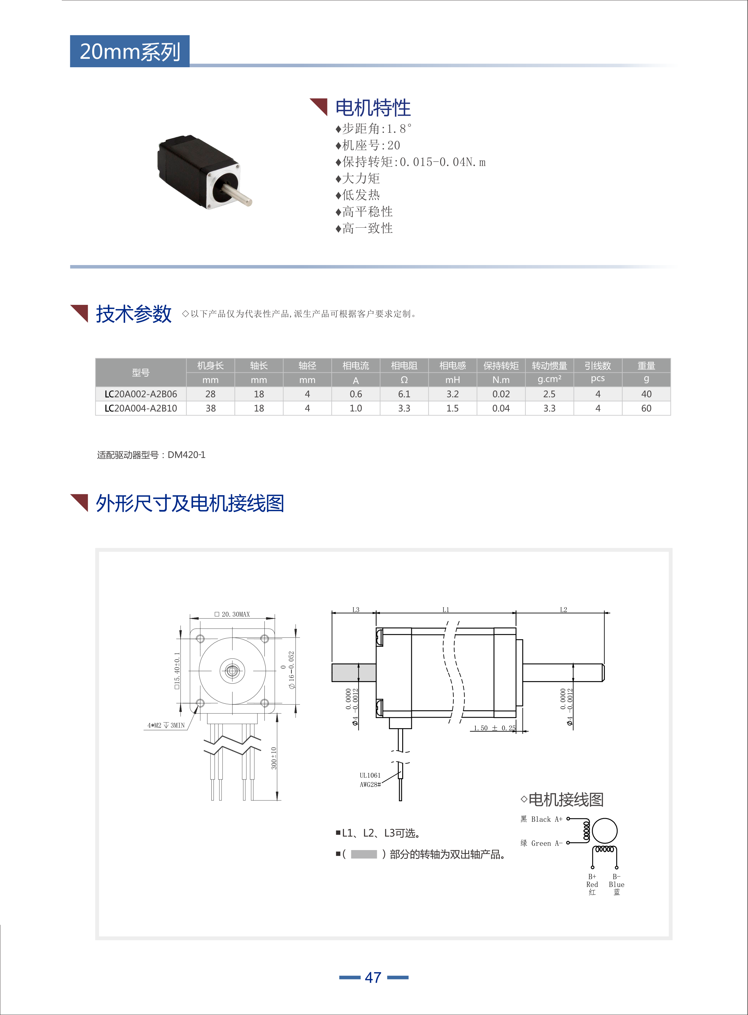 20步进电机特性:步距角:1.8,机座号:20,保持转矩:0.015-0.04N.m,大力矩低发热,高平稳性,高一致性