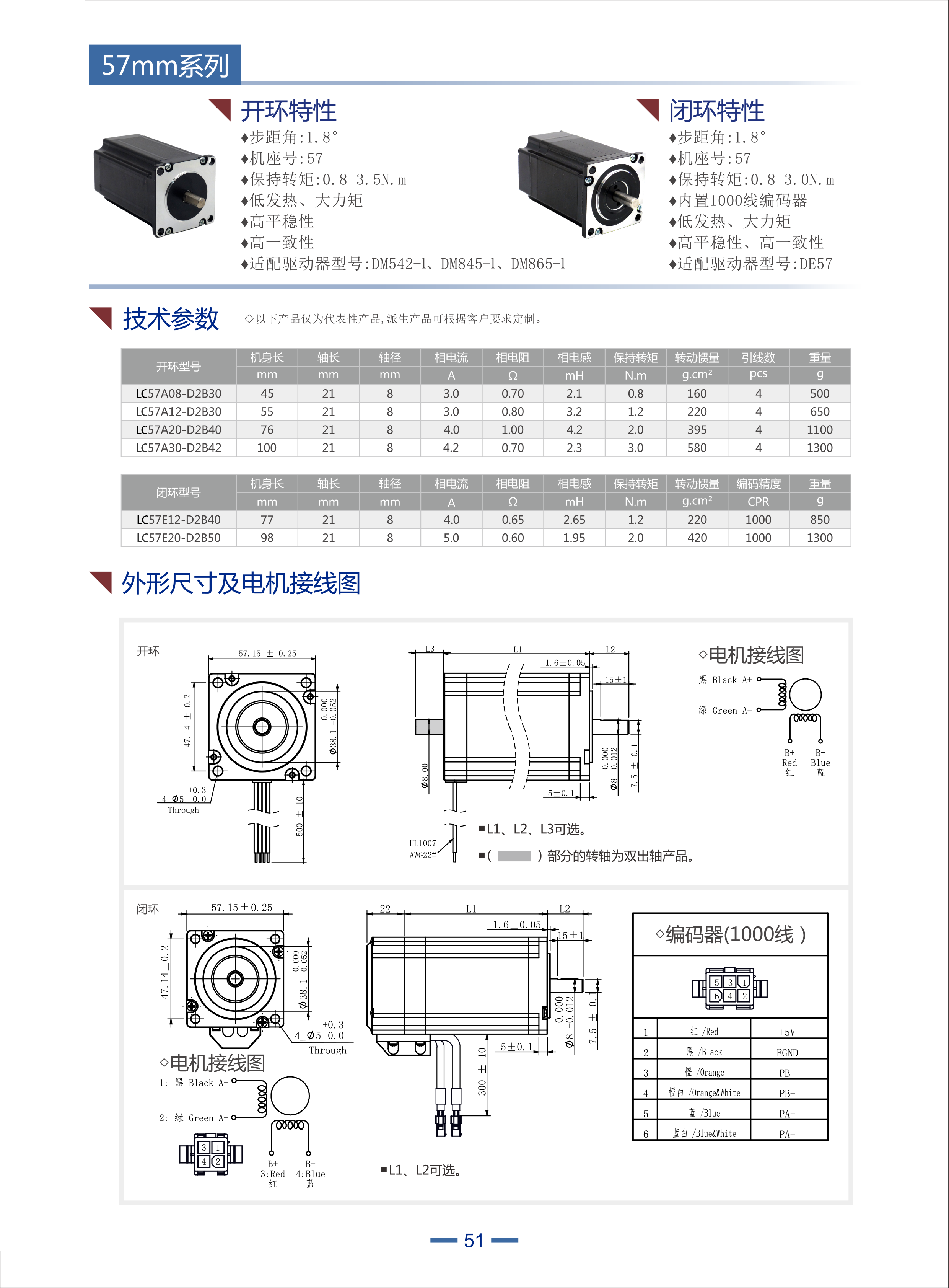 闭环特性 步距角:1.8° 机座号:57 保持转矩:0.8-3.0N.m 内置1000线编码器 低发热、大力矩 高平稳性、高一致性 适配驱动器型号:DE57 | 开环特性 步距角:1.8 机座号:57 保持转矩:0.8-3.5N.m 低发热、大力矩 高平稳性 高一致性 适配驱动器型号:DM542-1、DM845-1、DM865-1 |