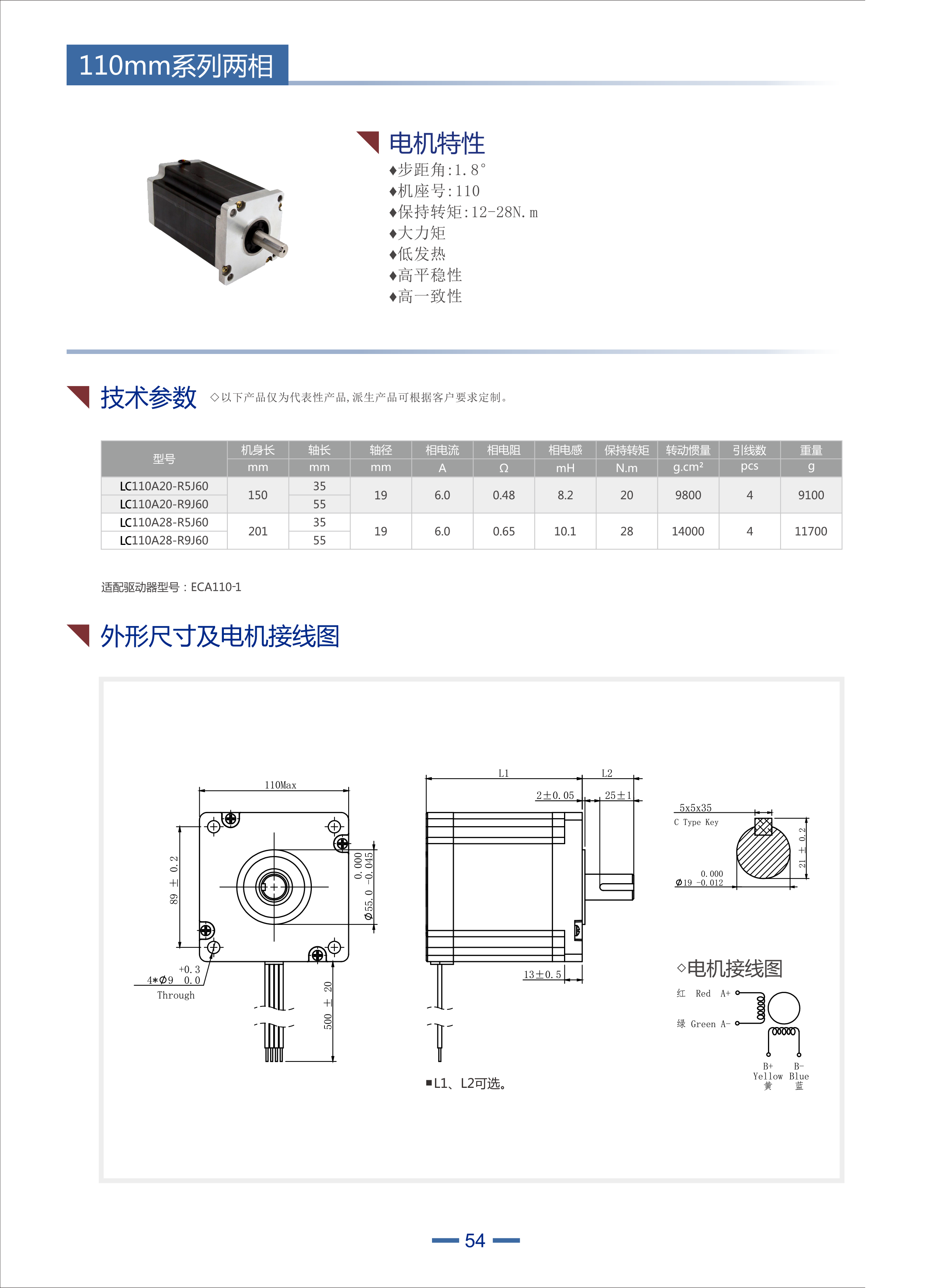 步距角:1.8 机座号:110 机身长度:105mm/201mm 轴径:19mm 轴长:35mm 55mm