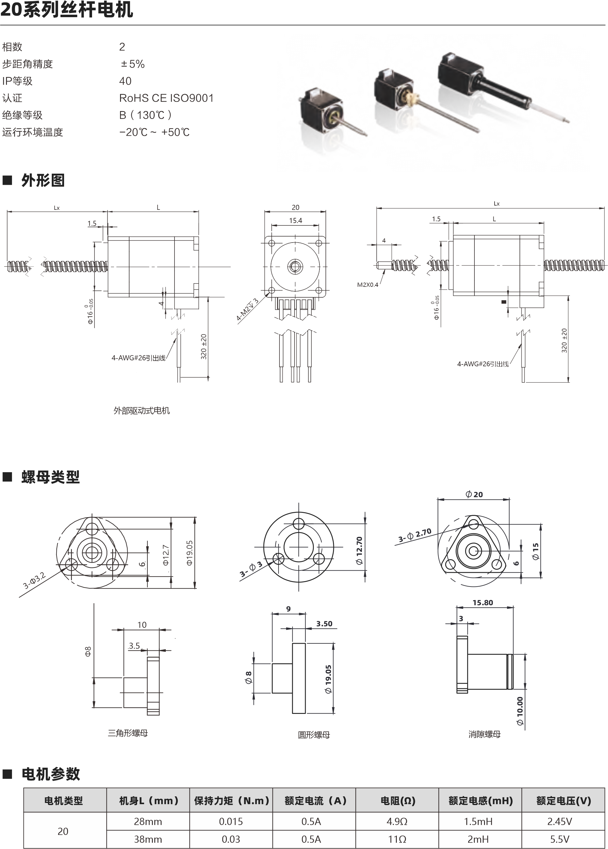 那么20丝杆电机有具体选型参数有哪些呢?参数和尺寸如下: