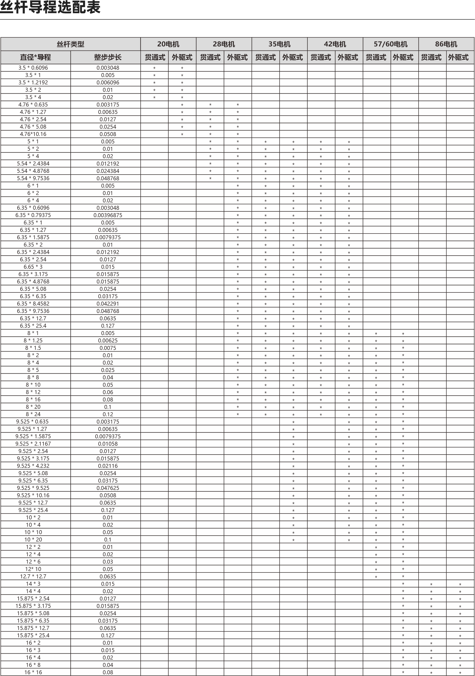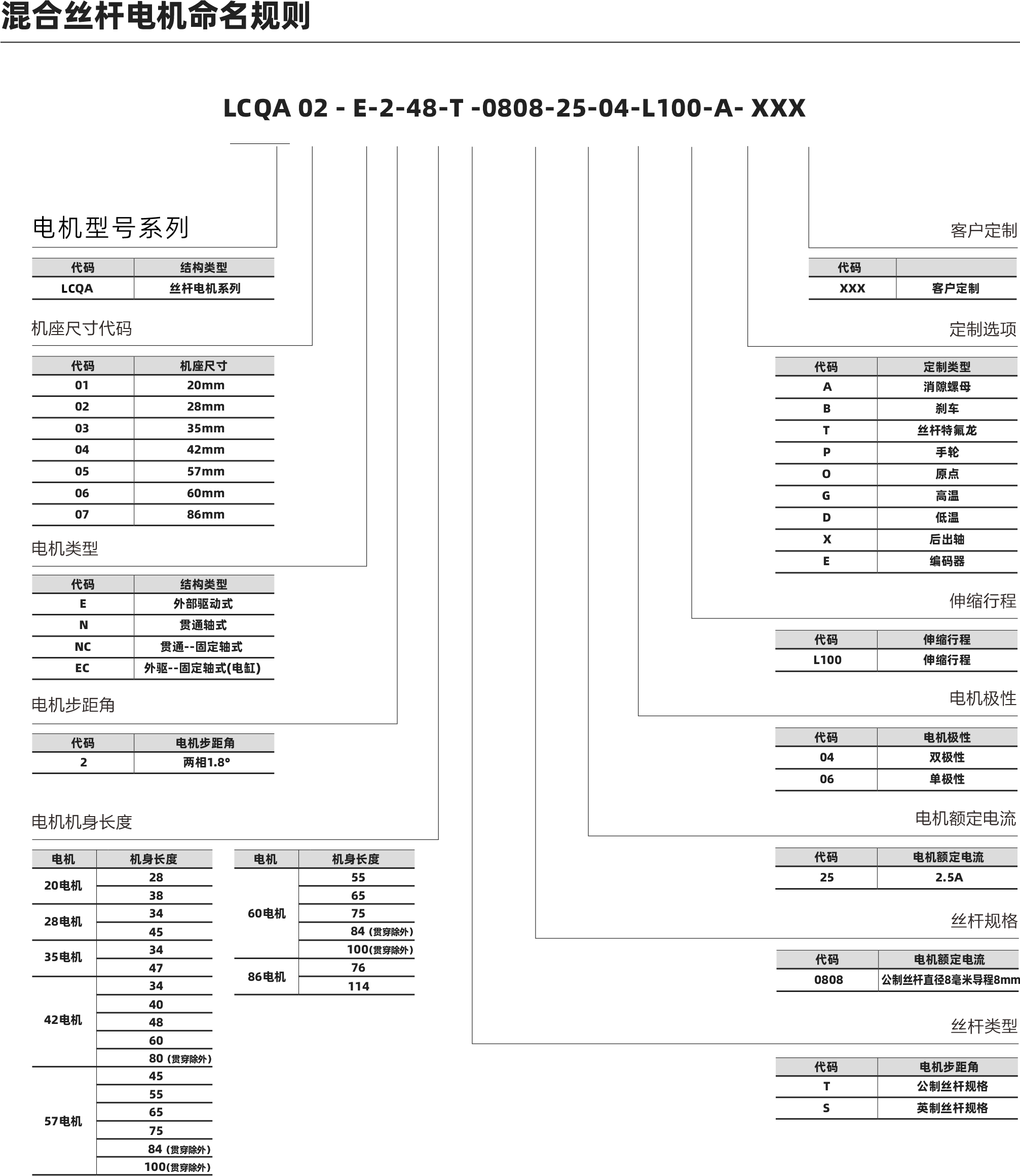 立成全系列外驱式梯形丝杆电机命令规则和型号参数一览表,帮助您快速找到您所需要的丝杆电机型号,欢迎联系我们,为您量身定制。