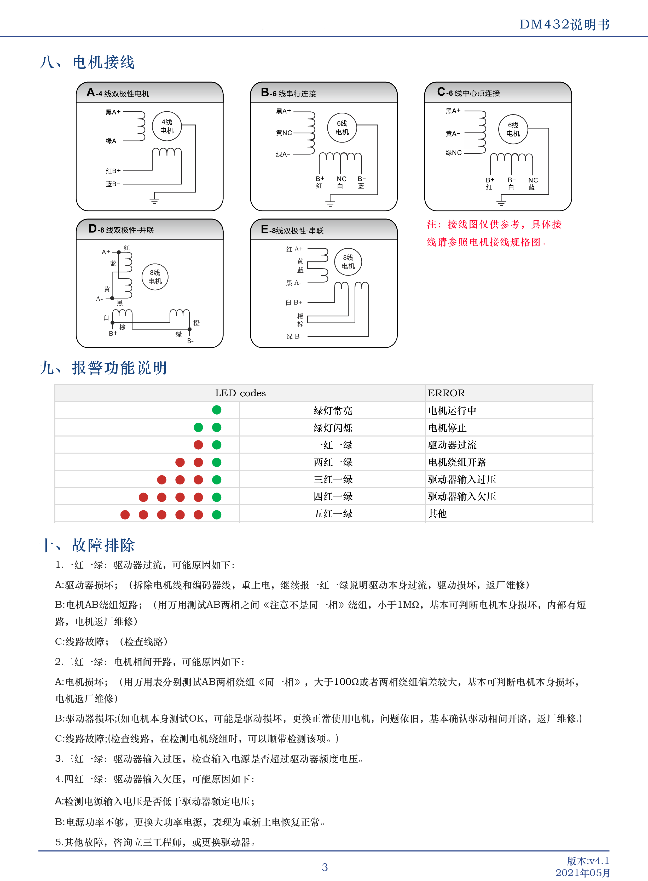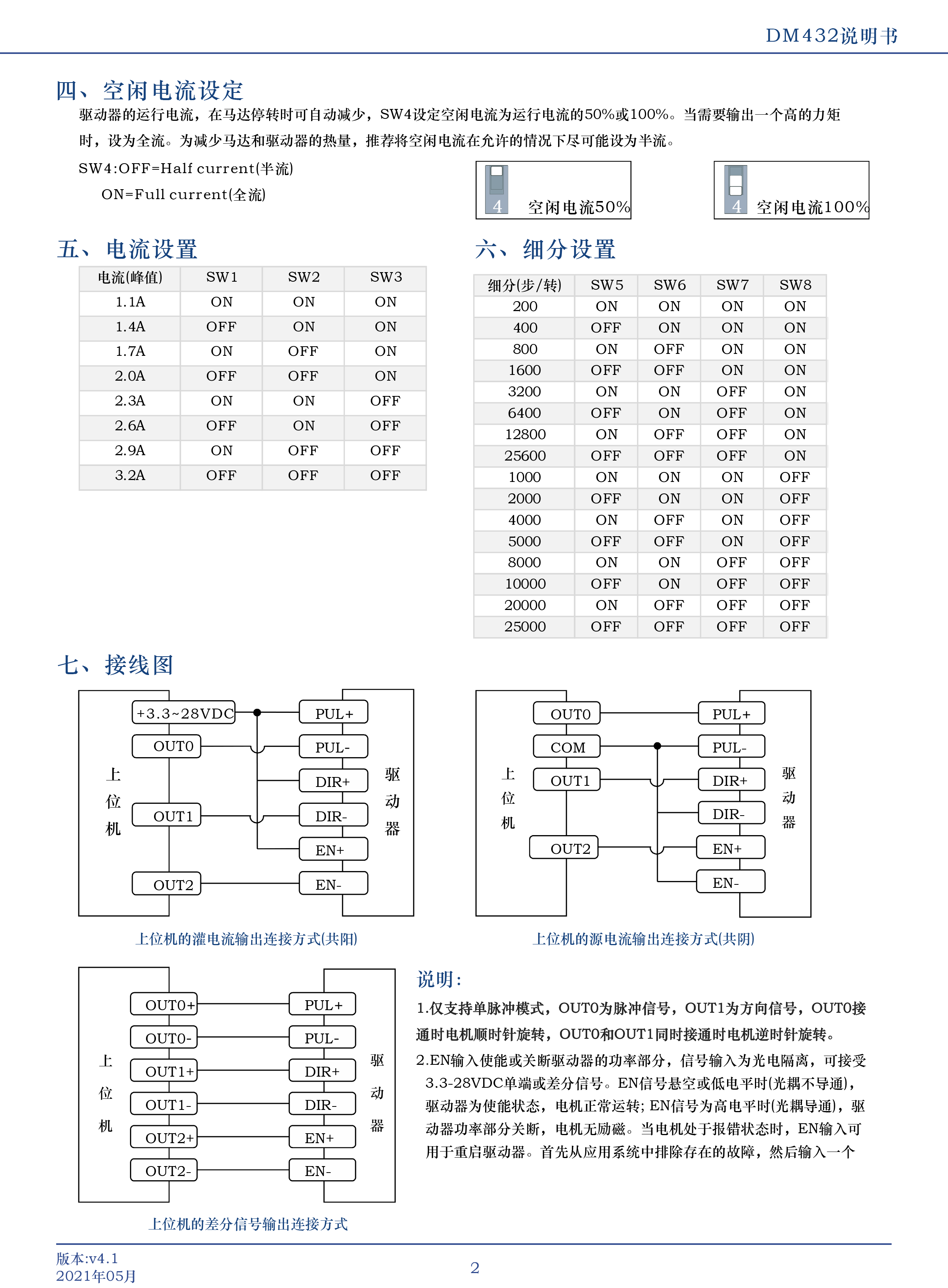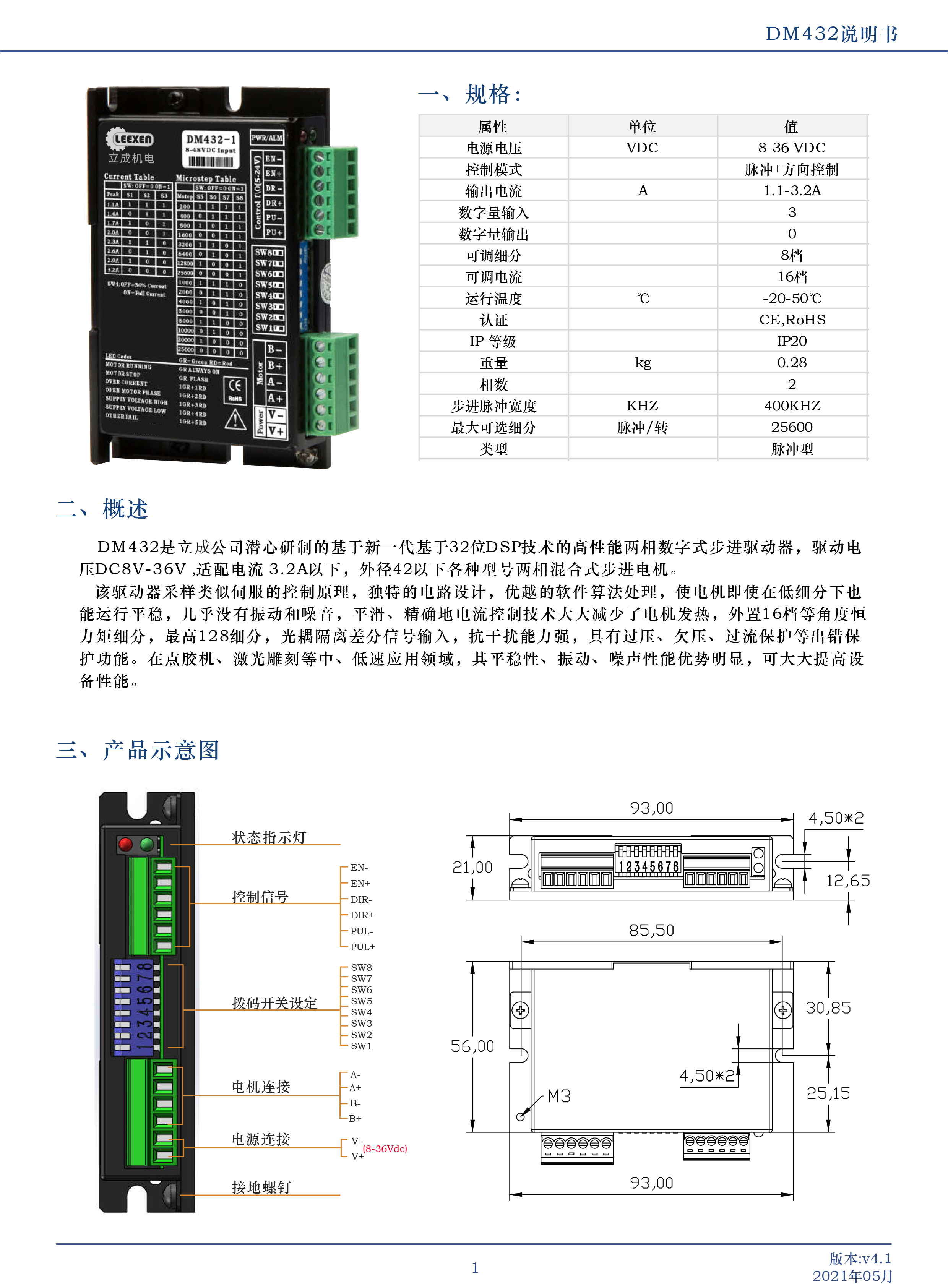 DM432是立成公司潜心研制的基于新一代基于32位DSP技术的高性能两相数字式步进驱动器,驱动电压DC8V-36V适配电流 32A以下,外径42以下各种号两相混合式步进电机该驱动器采样类似伺服的控制原理,独特的电路设计,优越的软件算法处理,使电机即使在低细分下也能运行平稳,几乎没有振动和噪音,平滑、精确地电流控制技术大大减少了电机发热,外置16档等角度恒力矩细分,最高128细分,光耦隔离差分信号输入,抗干扰能力强,具有过压、欠压、过流保护等出错保护功能。在点胶机、激光雕刻等中、低速应用领域,其平稳性、振动、噪声性能优势明显,可大大提高设备性能。
