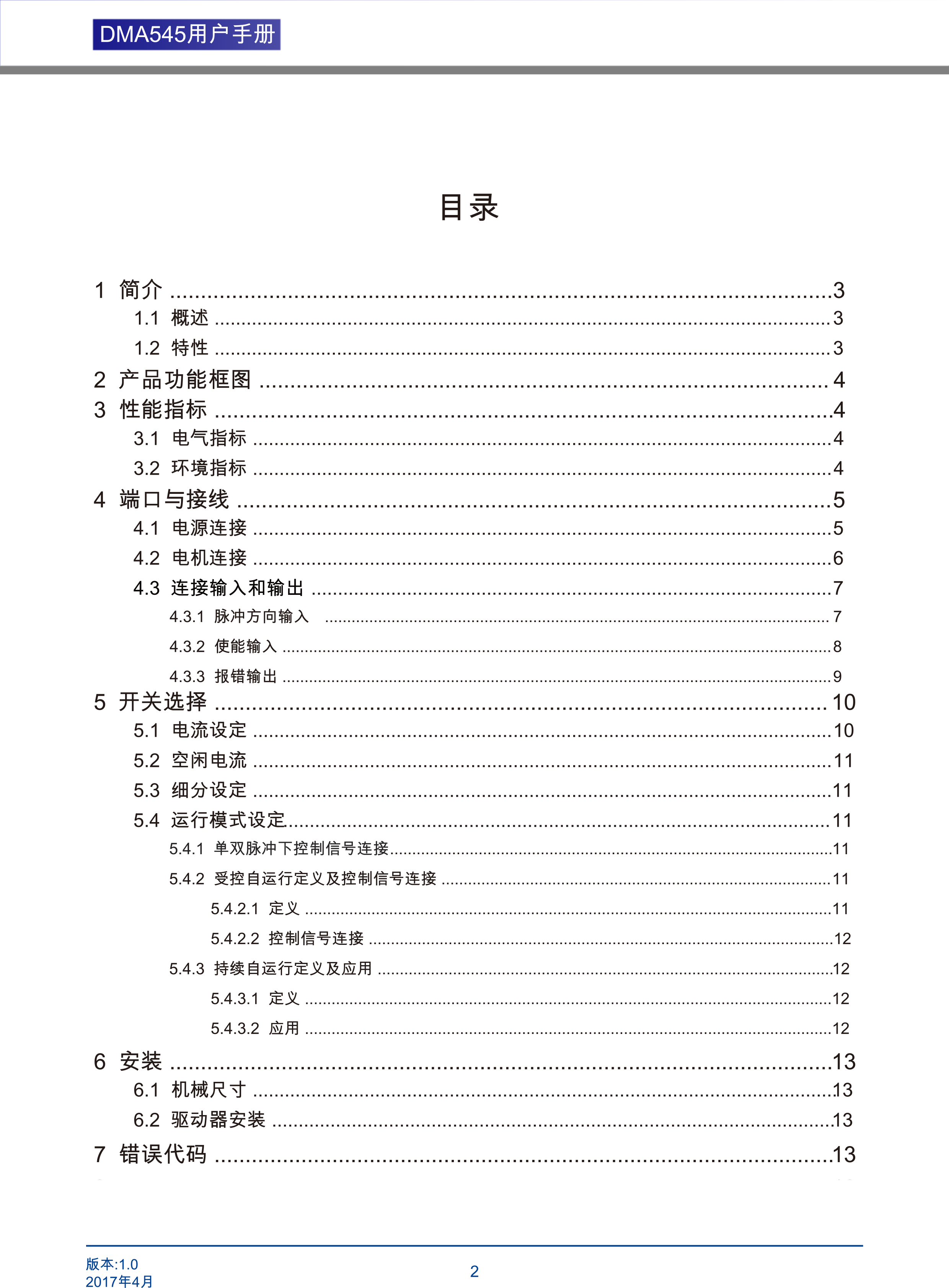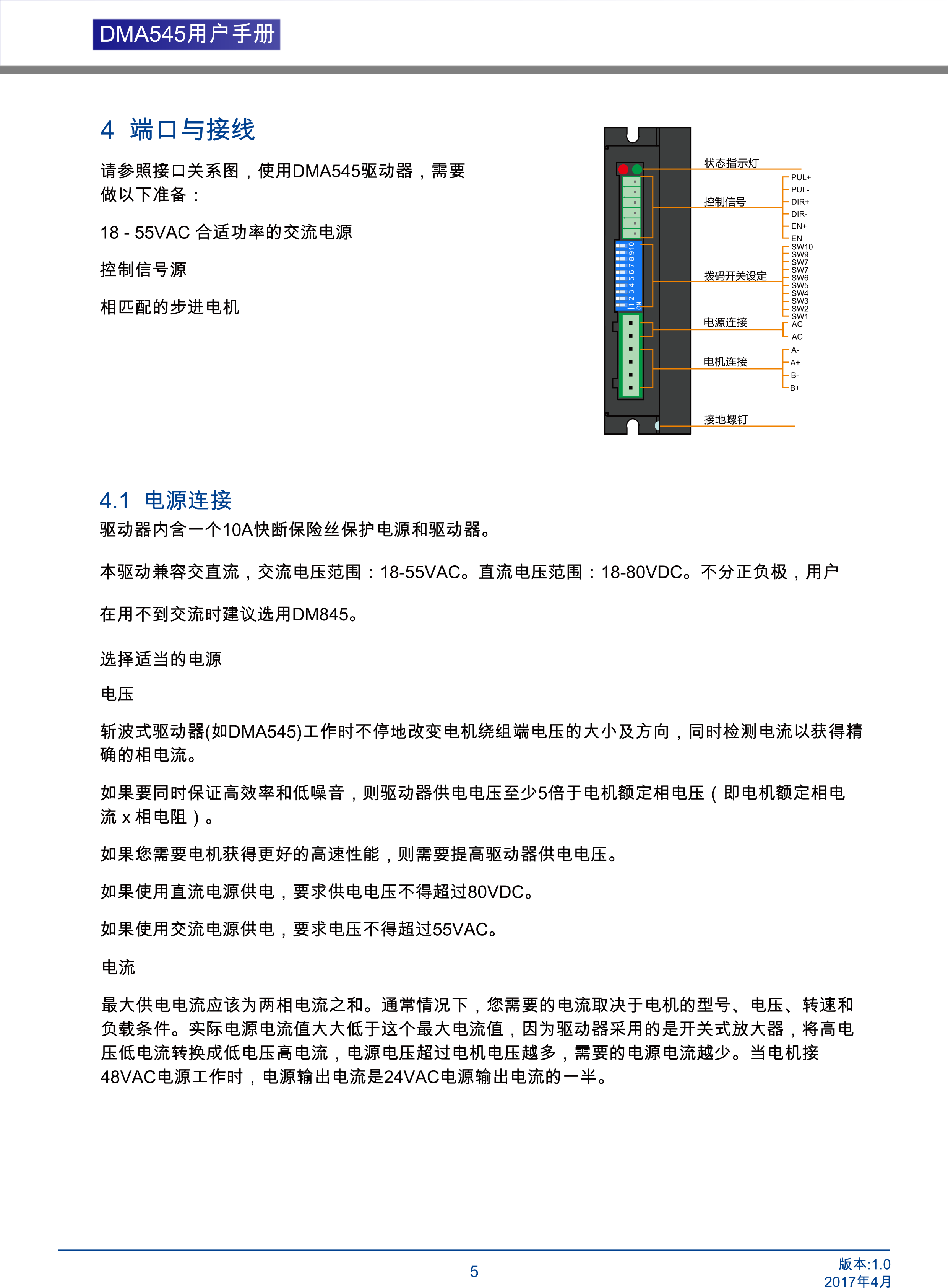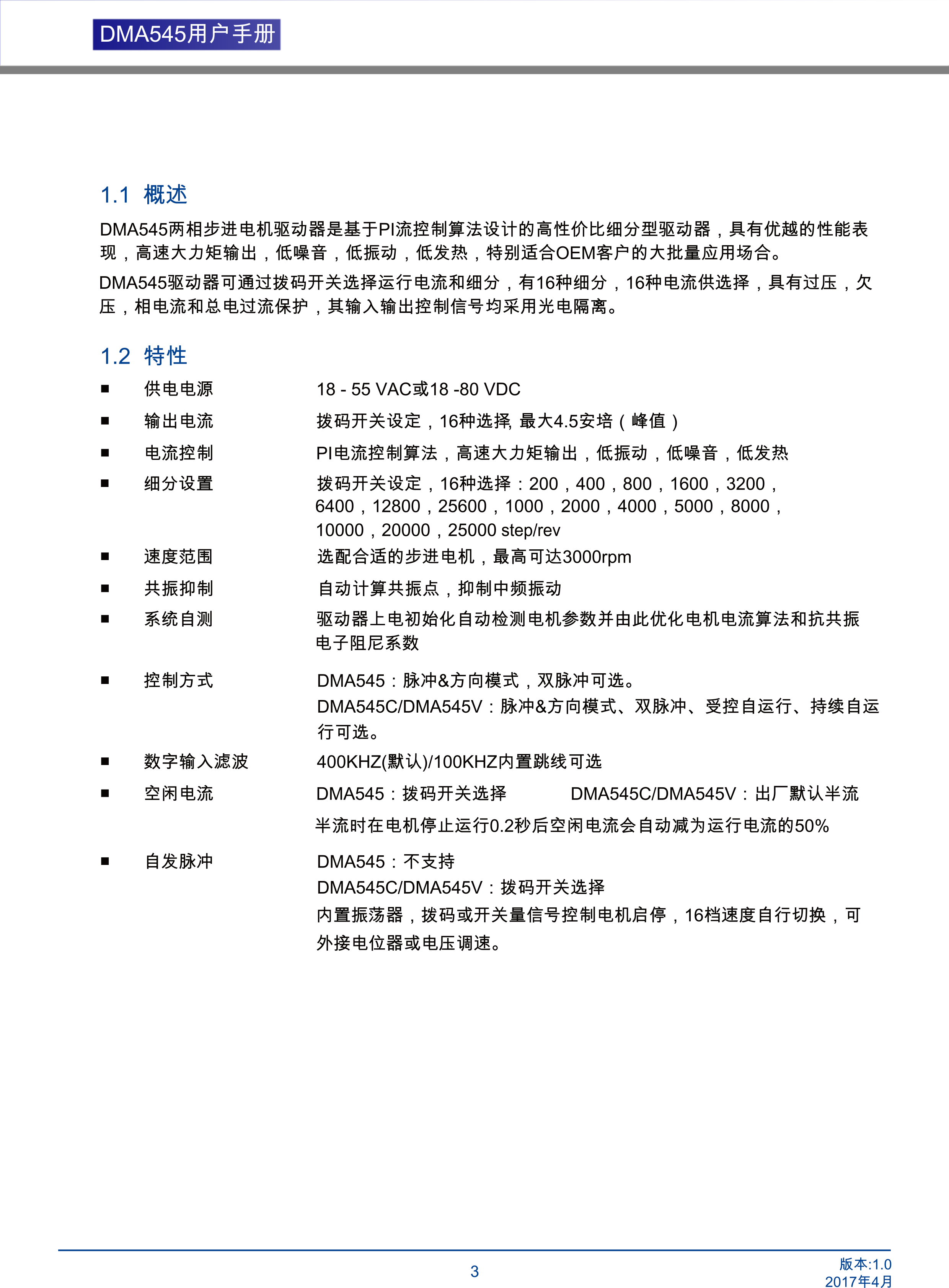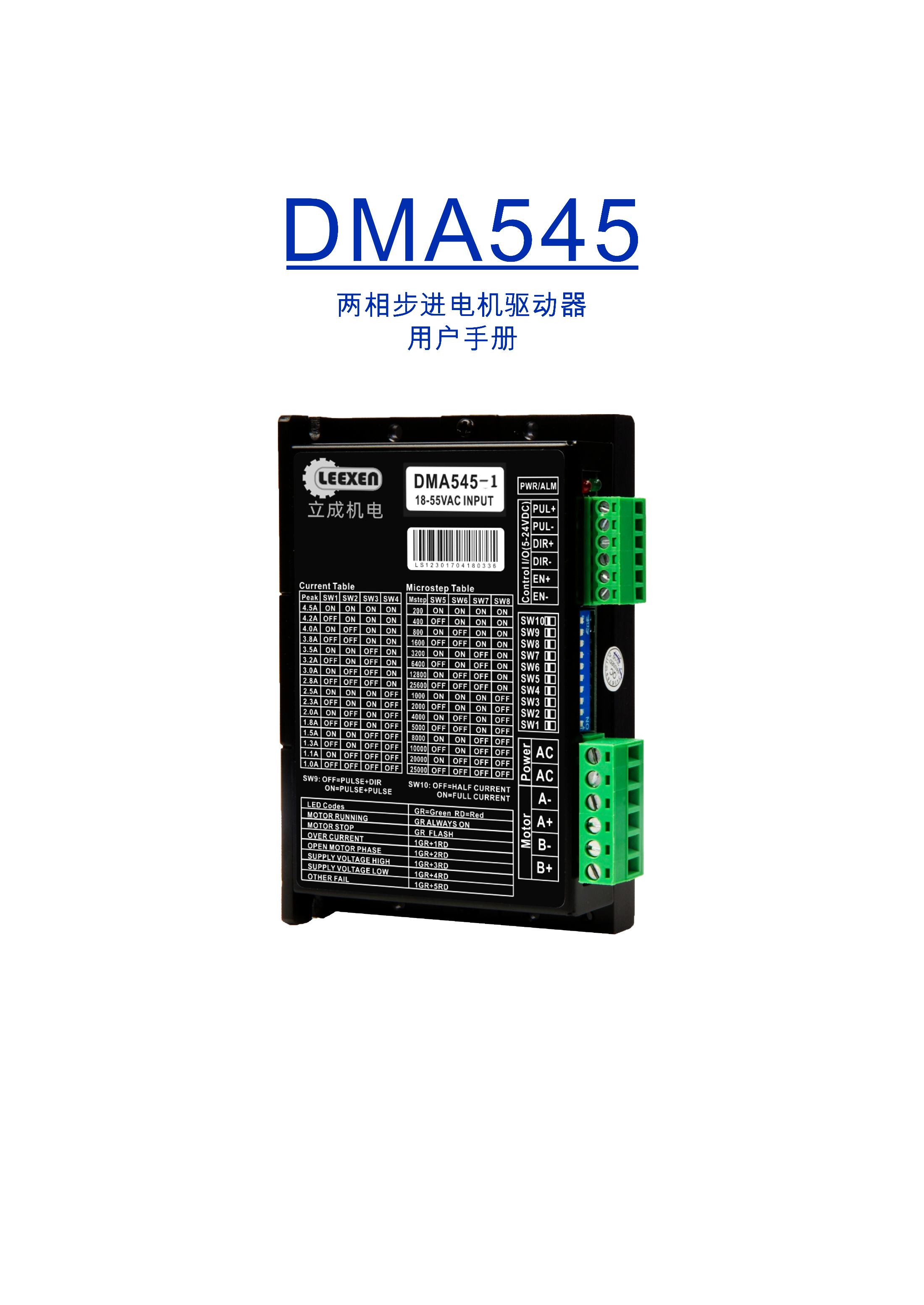 DMA545两相步进电机驱动器是基于PI流控制算法设计的高性价比细分型驱动器,具有优越的性能表现,高速大力矩输出,低噪音,低振动,低发热,特别适合OEM客户的大批量应用场合。DMA545驱动器可通过拨码开关选择运行电流和细分,有16种细分,16种电流供选择,具有过压,欠压,相电流和总电过流保护,其输入输出控制信号均采用光电隔离。