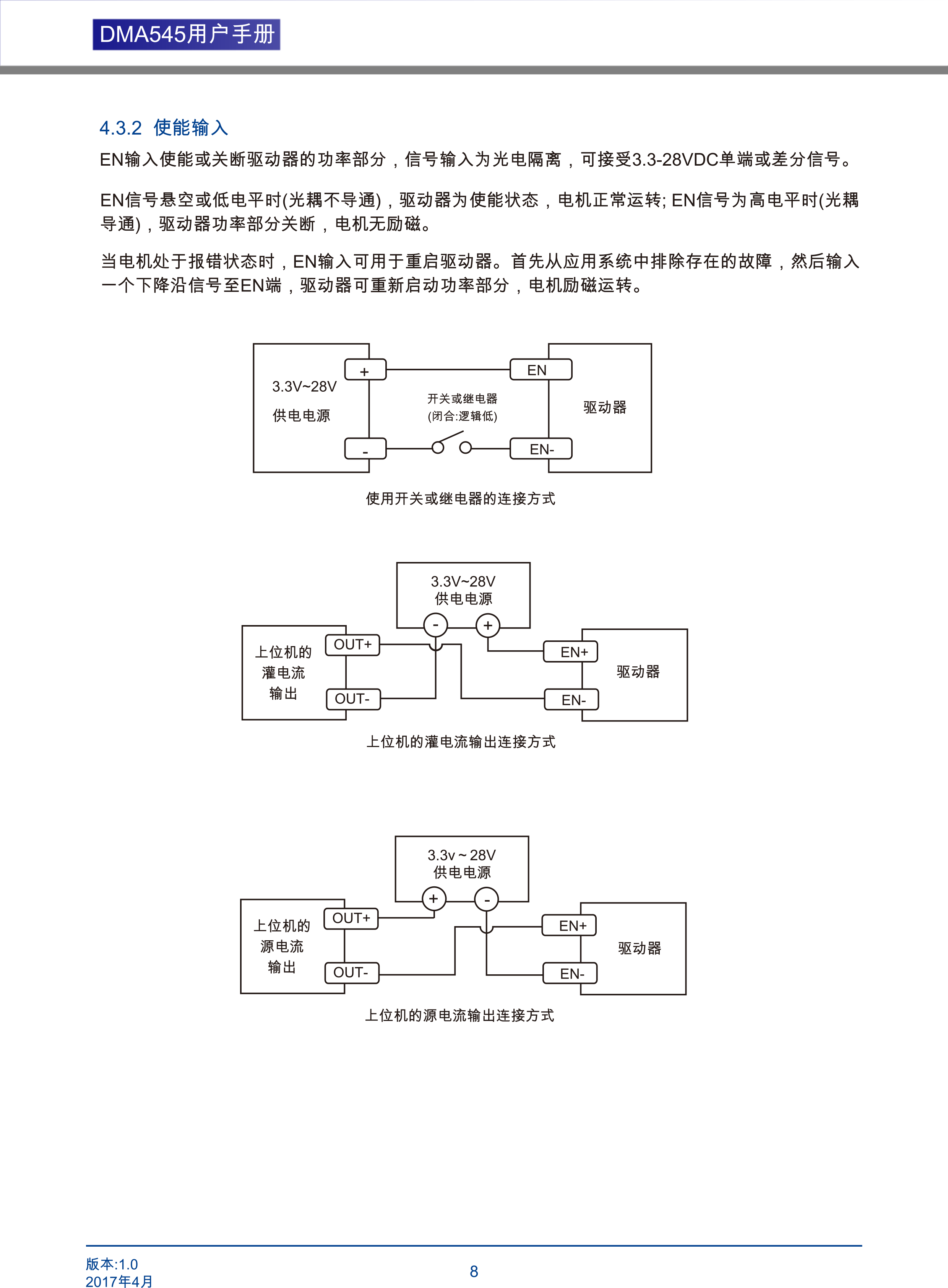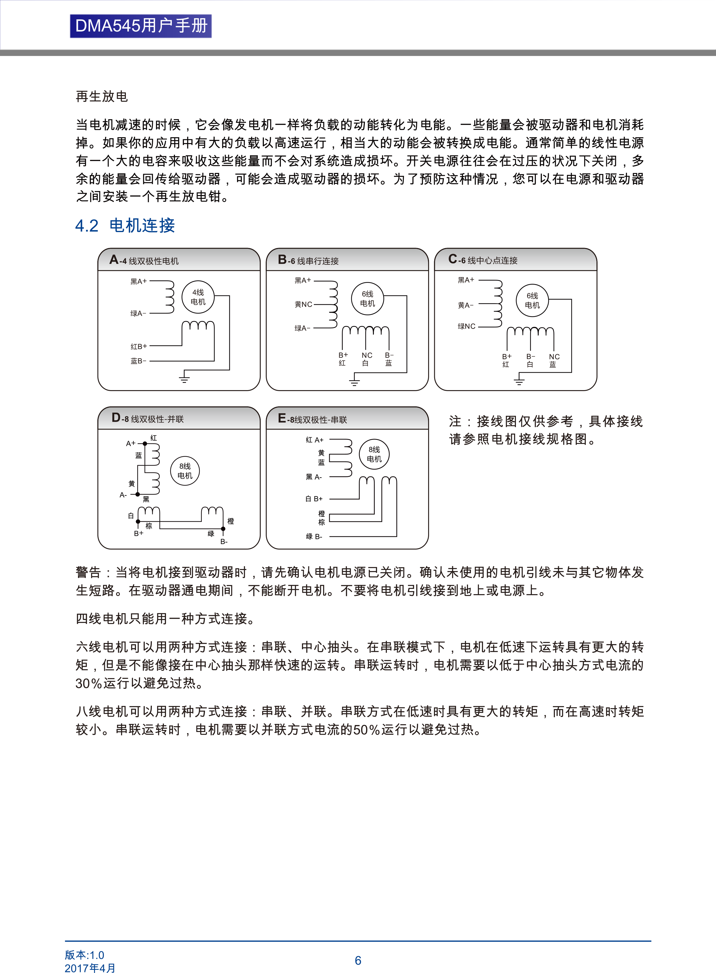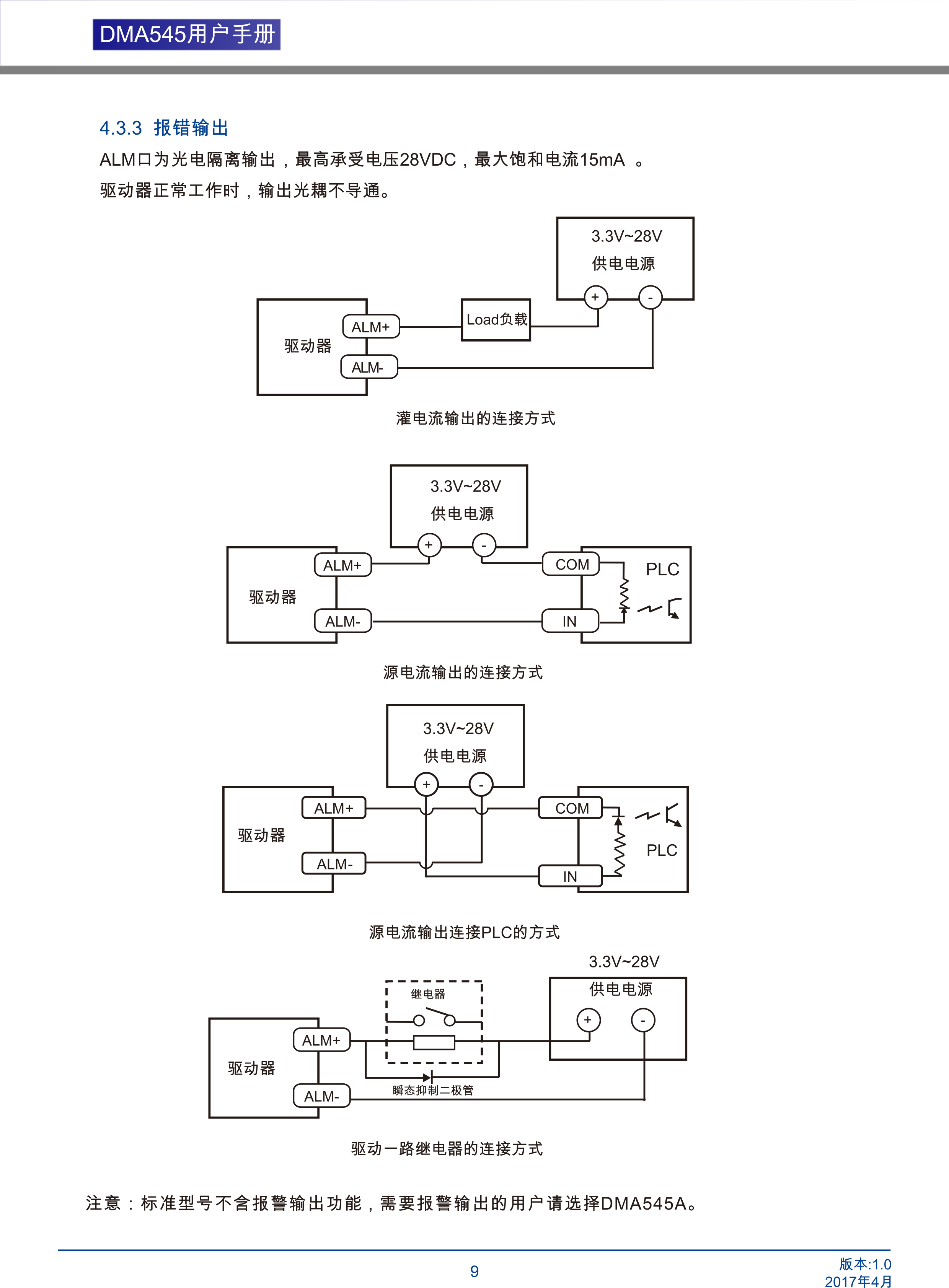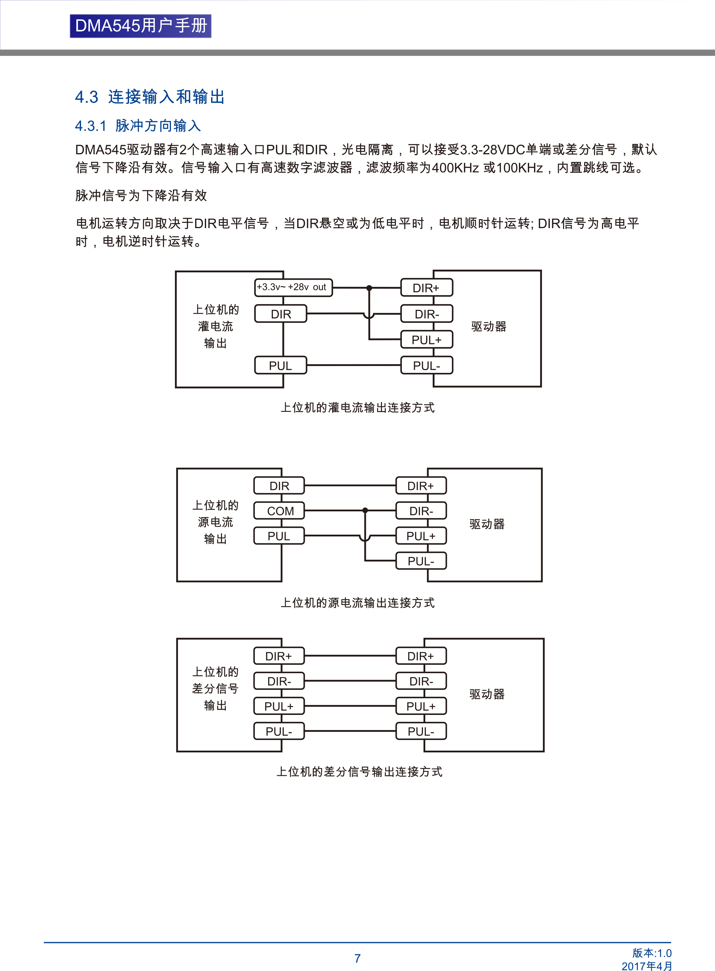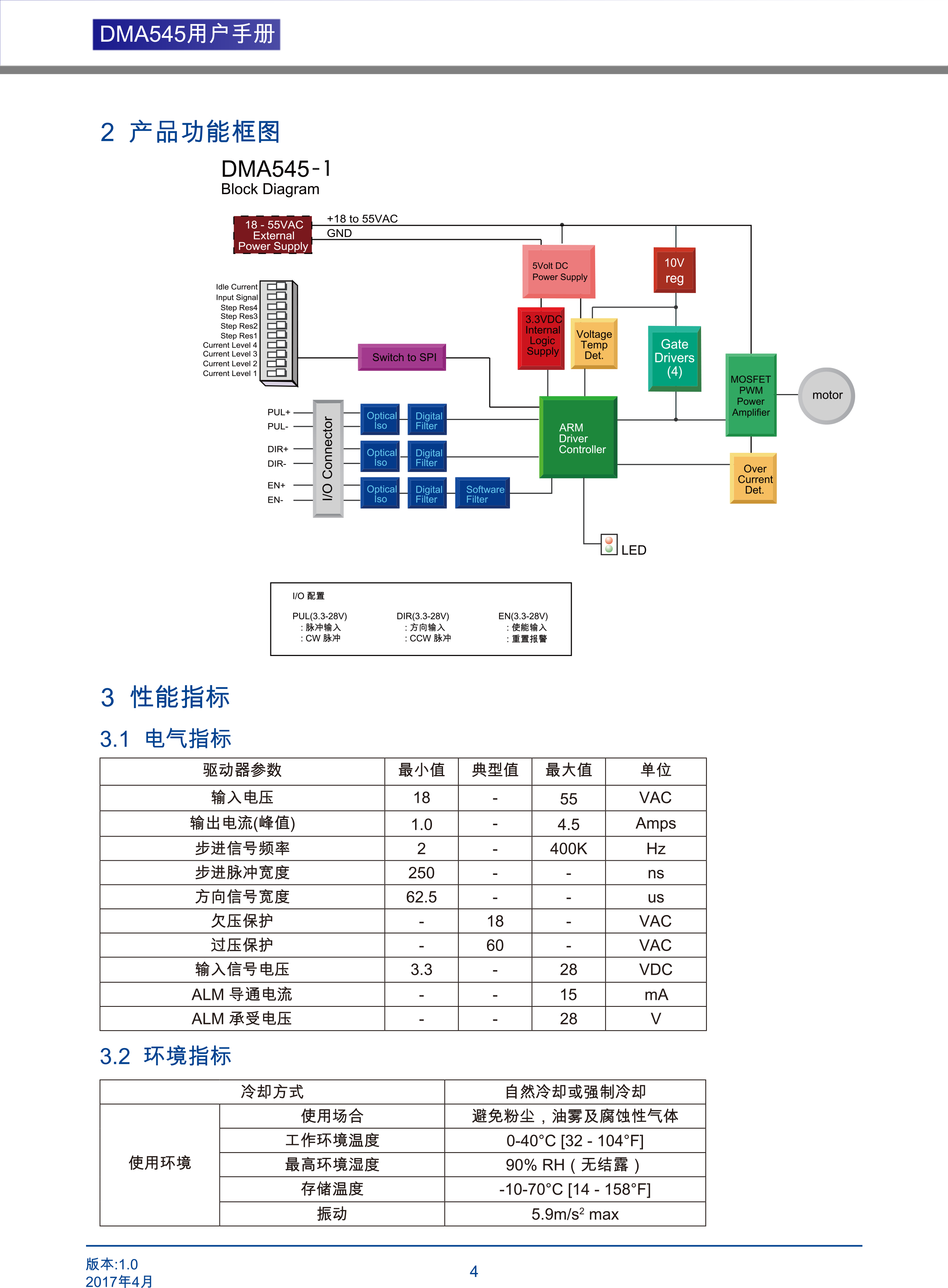 DMA545两相步进电机驱动器是基于PI流控制算法设计的高性价比细分型驱动器,具有优越的性能表现,高速大力矩输出,低噪音,低振动,低发热,特别适合OEM客户的大批量应用场合。DMA545驱动器可通过拨码开关选择运行电流和细分,有16种细分,16种电流供选择,具有过压,欠压,相电流和总电过流保护,其输入输出控制信号均采用光电隔离。