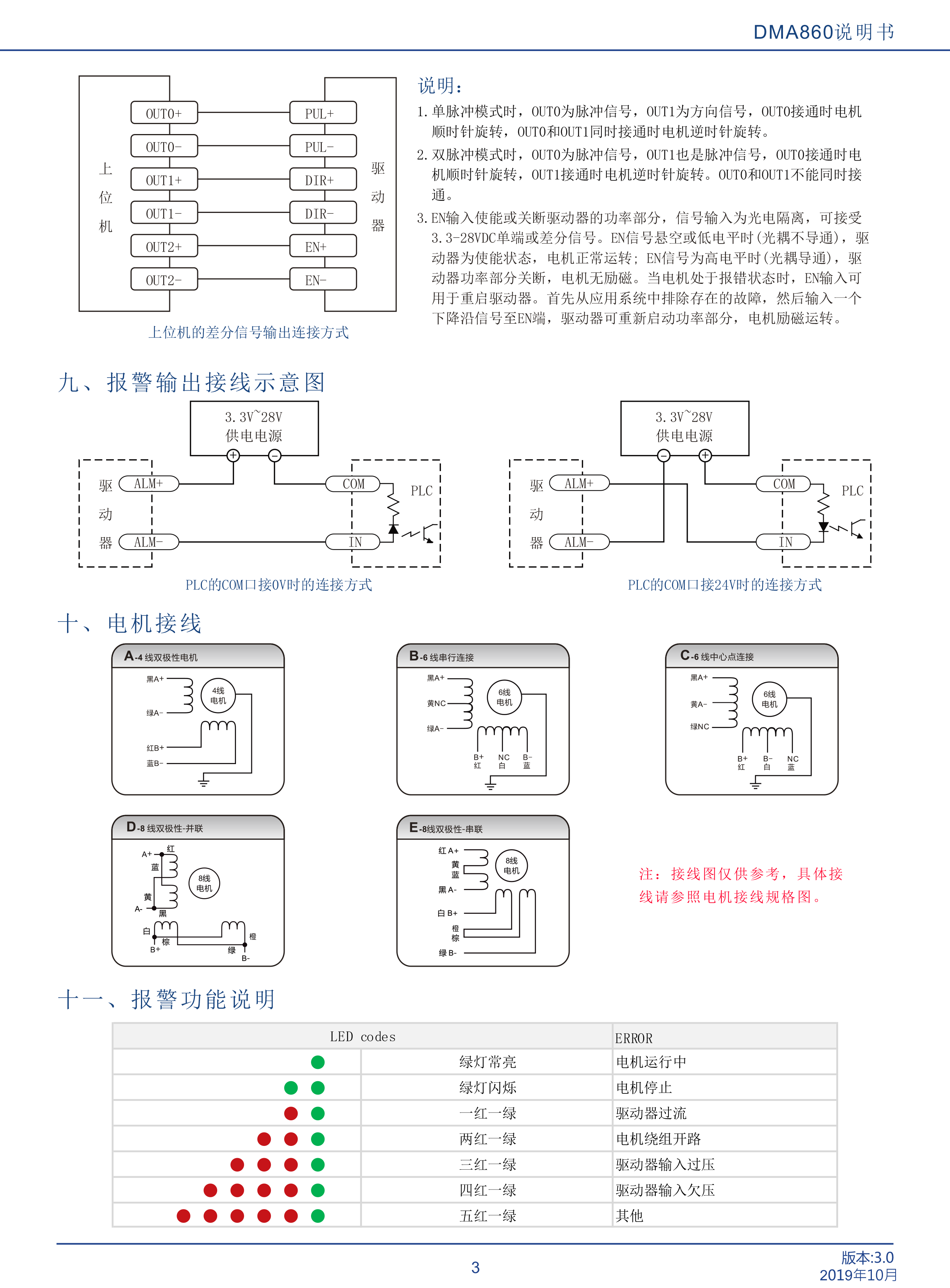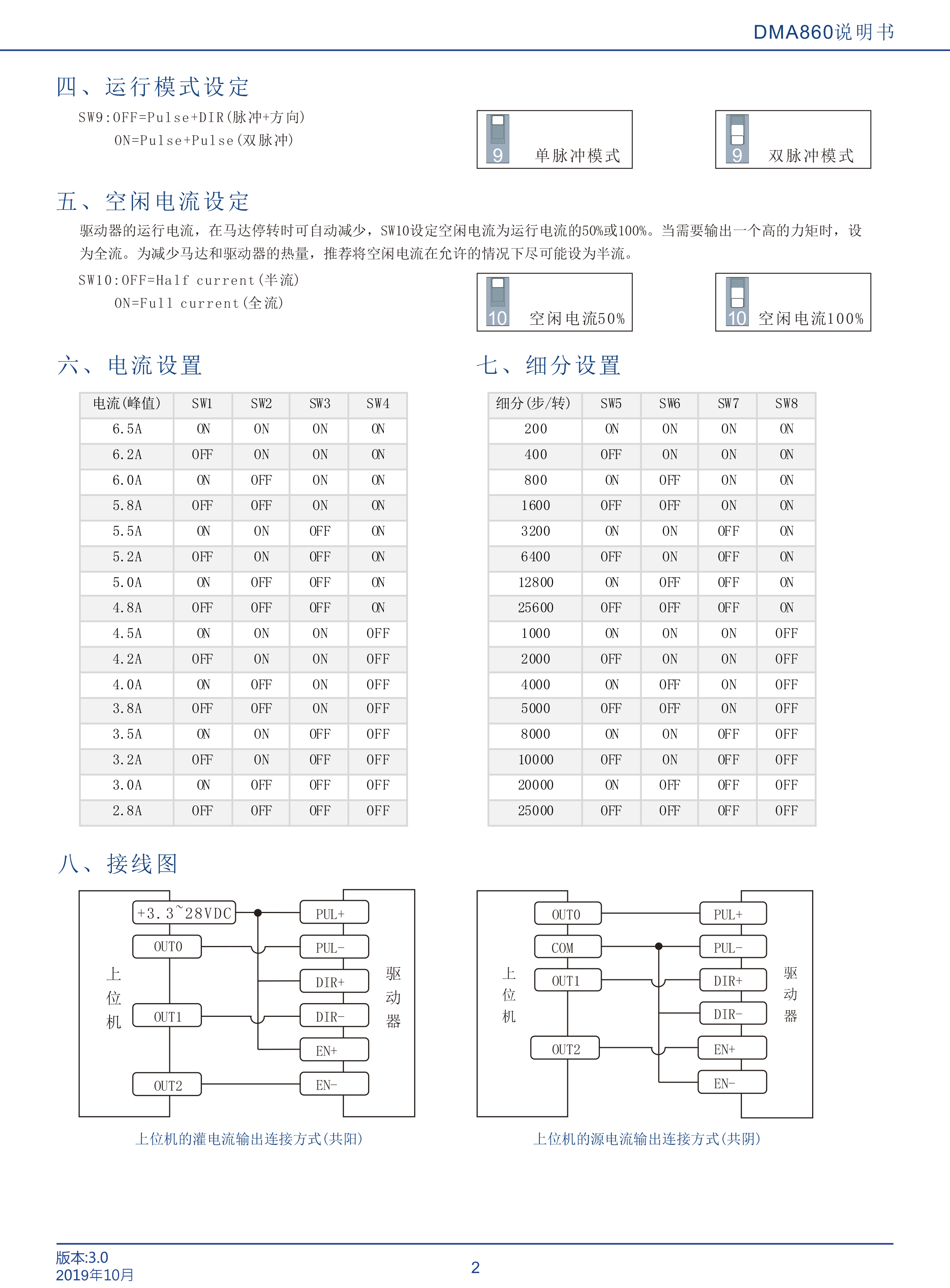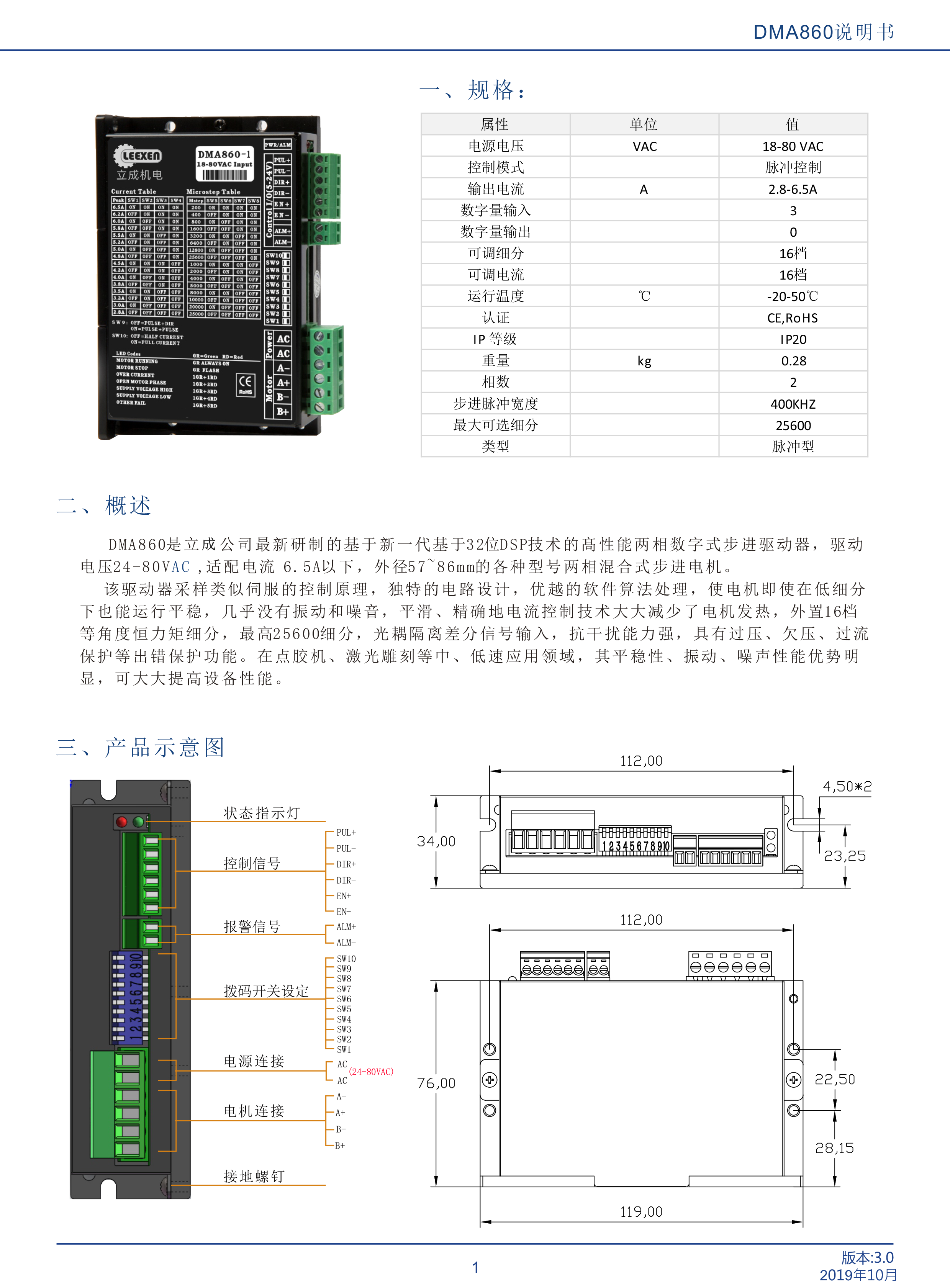 DMA860是立成公司最新研制的基于新一代基于32位DSP技术的高性能两相数字式步进驱动器,驱动电压24-80VAC,适配电流 6.5A以下,外径57~86mm的各种型号两相混合式步进电机。该驱动器采样类似伺服的控制原理,独特的电路设计,优越的软件算法处理,使电机即使在低细分下也能运行平稳,几乎没有振动和噪音,平滑、精确地电流控制技术大大减少了电机发热,外置16档等角度恒力矩细分,最高25600细分,光耦隔离差分信号输入,抗于扰能力强,具有过压、欠压、过流保护等出错保护功能。在点胶机、激光雕刻等中、低速应用领域,其平稳性、振动、噪声性能优势明显,可大大提高设备性能。